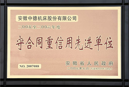 近日,安徽中德机床股份有限公司被安徽省人民政府授予2005-2006年度“守合同重信用先进单位”这一称号。这也是我公司继由马鞍山市工商局、市人民政府、省工商局多次授予此类称号后,再次获得的更高级别的荣誉。