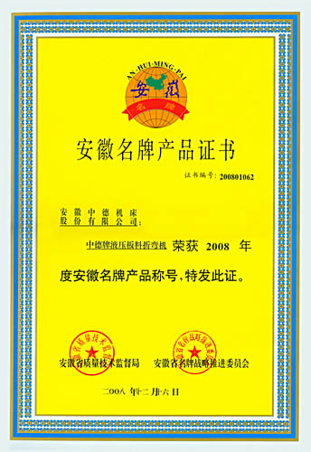中德牌液压板料折弯机喜获2008年“安徽省名牌产品”的殊荣,这是继2005年中德牌液压摆式剪板机获“安徽名牌产品”之后,中德机床的质量和信誉又一次获得认可。与此同时,中德牌液压摆式剪板机也顺利通过安徽名牌产品的复审,证书的有效期将延长至2013年。