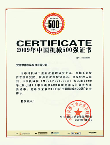 由中国机械工业企业管理协会主办,机械工业经济管理研究院、世界企业实验室协办,世界经理人周刊、中国机械网承办的2009年(第七届)《中国机械500强研究报告》调查活动公布,中德机床荣获2009年“中国机械500强”。