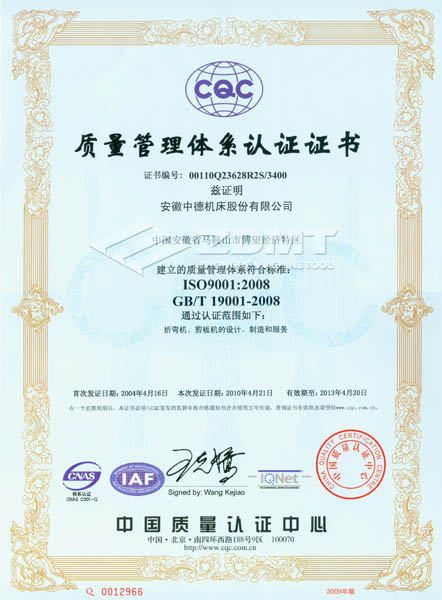 2010年4月,我公司顺利通过了ISO 9001:2008版换证复审,获得认证证书(证书编号:00110Q23628R2S/3400)。在此次复审过程中,中国质量认证中心(CQC)对我公司的质量体系运行情况进行了全方位严格审核,并对中德公司质量管理工作给予了充分的肯定。