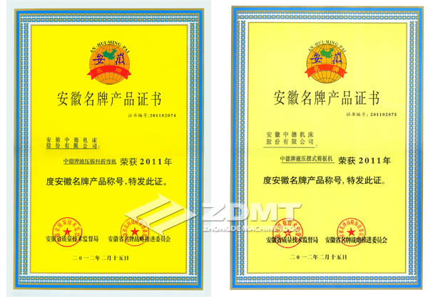 2012年3月22日,马鞍山市召开了全市质量技术监督工作会议,会议对2011年获得质监部门相关荣誉的企业与个人进行了表彰,我公司中德牌液压多路阀摆式液压剪板机和中德牌液压多路阀板料折边机两个产品分别通过了2011年“安徽名牌”的复审。